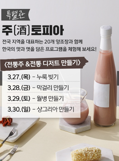 3월 28일(금) 막걸리 만들기 - 한국 대표 전통주인 막걸리를 직접 만들어보세요.